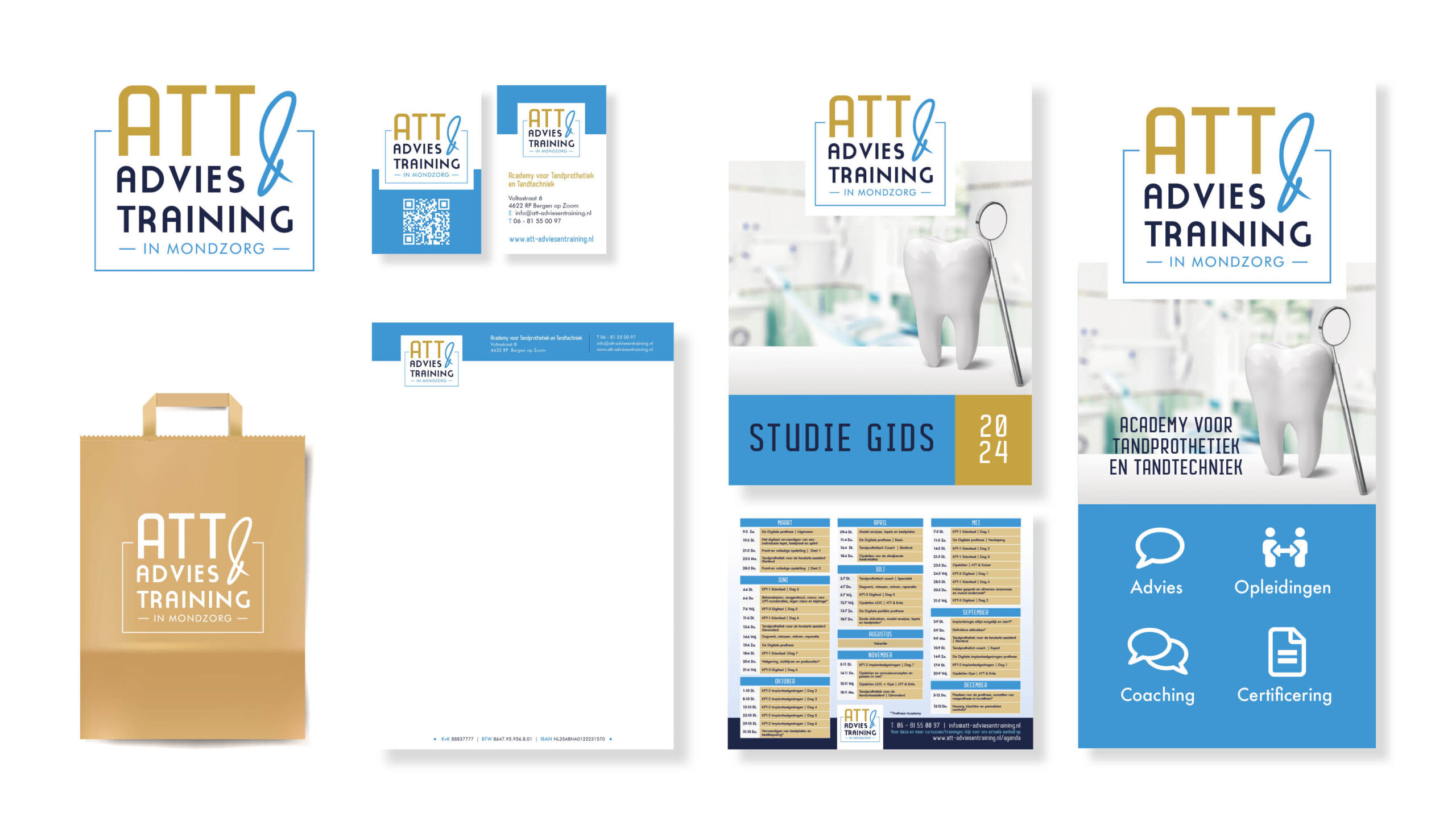 att advies & training Een complete huisstijl verzorging voor ATT Advies & Trainingen in Mondzorg. Van logo ontwerp, visitekaartjes. briefpapier, een roll-up banner, tassen, muismatten en een studiegids. category Huisstijl date 19 april 2024