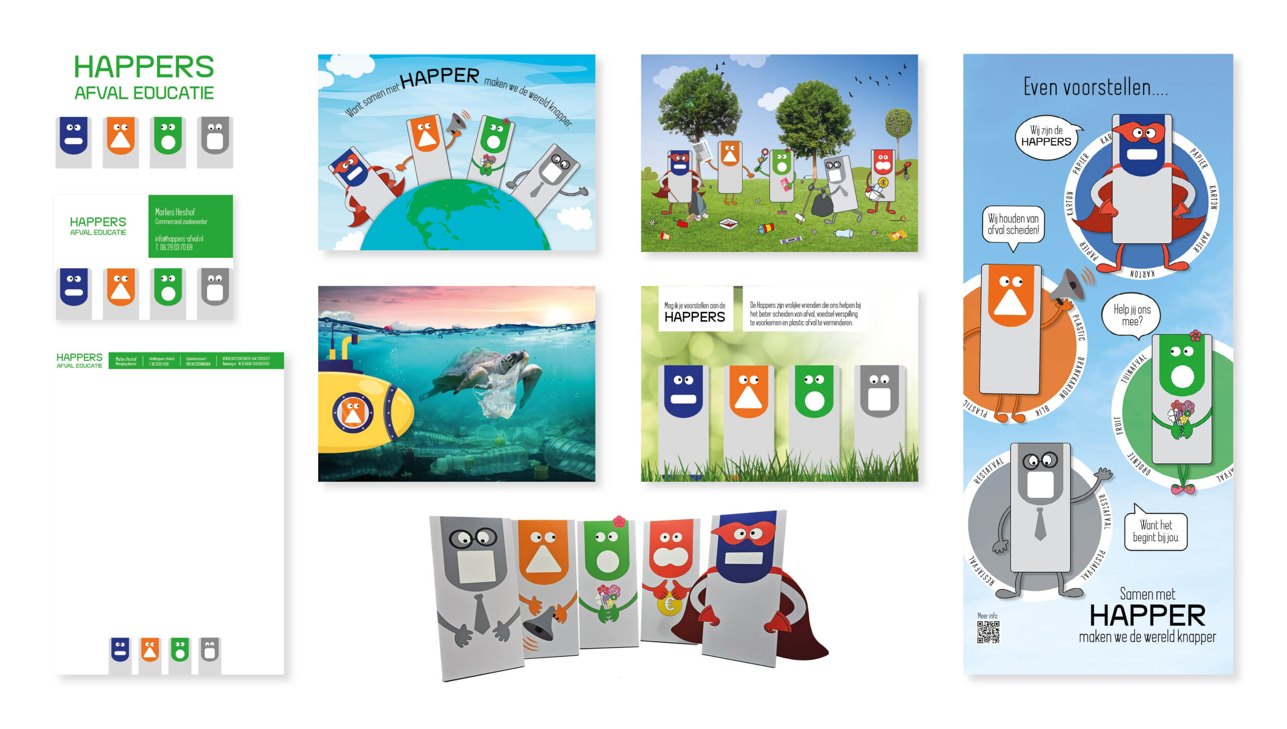 Happers afval Educatie. Na het ontwerp van het logo, het visitekaartje en het briefpapier, zijn de Happers tot leven gekomen op een roll-up banner, in filmpjes, kleur- en zoekplaten, allerlei educatie materiaal en zelfs in een levensgrootte versie in forex materiaal.
